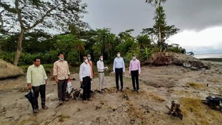 ভাঙ্গা বেড়িবাঁধ পরিদর্শন করছেন জেলা প্রশাসকসহ পানি উন্নয়ন বোর্ডের কর্মকর্তারা