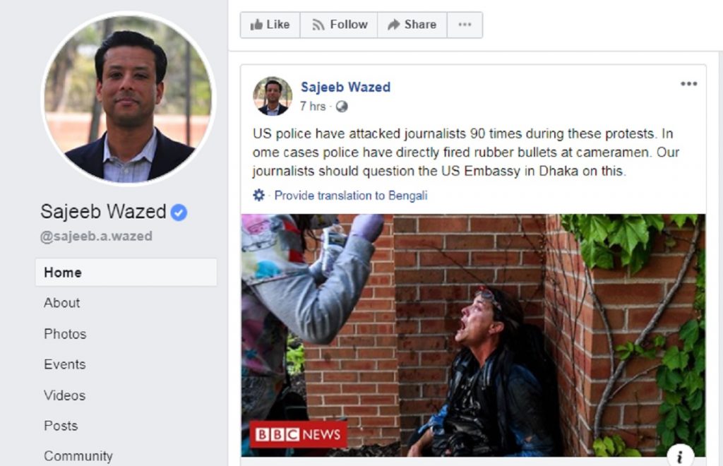 যুক্তরাষ্ট্রে কৃষ্ণাঙ্গ হত্যার বিচার চেয়ে চলমান আন্দোলনে সাংবাদিকদের ওপর দেশটির পুলিশ প্রায় ৯০ বার হামলা চালিয়েছে। পুলিশ সরাসরি এক ক্যামেরাম্যানের ওপর রাবার বুলেট ছুড়ে মেরেছে। এসব ঘটনার জন্য ঢাকাস্থ মার্কিন দূতাবাসকে আমাদের সাংবাদিকদের প্রশ্ন করা উচিত। এ মন্তব্য করেছেন প্রধানমন্ত্রীর তথ্যপ্রযুক্তিবিষয়ক উপদেষ্টা সজীব ওয়াজেদ জয়।