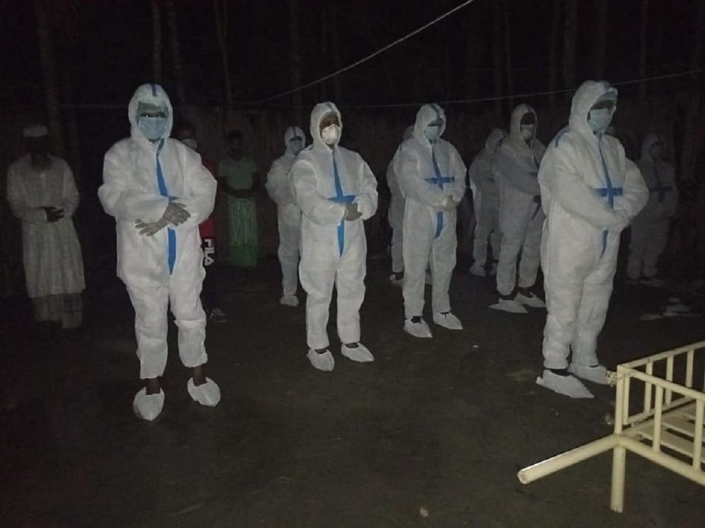 আমরা সবাইকে প্রস্তুত করে রাজপাশায় পৌঁছাই রাত ১১ঃ৩০ এ। তখন পর্যন্ত লাশের গোসল হয়নি। কেউ কাছেও আসেনি। লাশটি ঘরের বাইরে আনার মতোও কেউ ছিলো না। হতভাগ্যের ঘরে তখন তার স্ত্রী, এক কন্যা, আরেক পুত্র ছিলো। অন্য আরেক ছেলে ঢাকা থেকে রওনা হয়েছে। সে বাড়িতে পৌঁছলেই মৃতব্যক্তির স্ত্রী এবং সন্তানেরা আমাদের জানান তার কোভিডের কোন লক্ষণ ছিলো না। কিন্তু লাশটি গোসলের জন্য বাইরে নিয়ে আসার জন্য হাতটি পর্যন্ত দিলো না। লাশ বাইরে আনলো ওই মেডিকেল টিমের তুহিন, আসাদসহ কয়েকজন, যাদের আমরা পিপিই পড়িয়ে দেই।