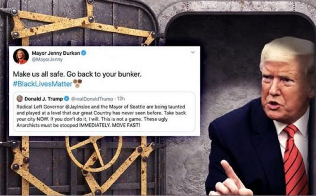 এরপরই পাল্টা টুইট করেন সিয়াটলের মেয়র জেনি ডুরকান। তিনি ট্রাম্পকে উদ্দেশ্যে করে লিখেন, ‘আমাদের সবাইকে নিরাপদ থাকতে দিন। আপনি নিজের বাঙ্কারে ফিরে যান।’