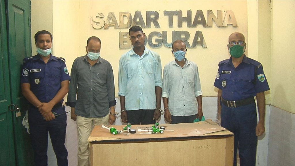 করোনা আইসোলেশন ইউনিটের অক্সিজেন সিলিন্ডার থেকে মিটার চুরি করে একটি বেসরকারি হাসপাতালে বিক্রির ঘটনায় বগুড়ার মোহাম্মদ আলী হাসপাতালের পরিচ্ছন্নতাকর্মীসহ তিন জনকে গ্রেফতার করেছে পুলিশ। শুক্রবার ওই পরিচ্ছনতাকর্মী দুটি সিলিন্ডার থেকে মিটার চুরি করে শহরের একটি শান্ত পলি ক্লিনিকের ম্যানেজারের কাছে বিক্রি করে দেন। রাতেই পুলিশ মিটারসহ তিন জনকে গ্রেফতার করে।