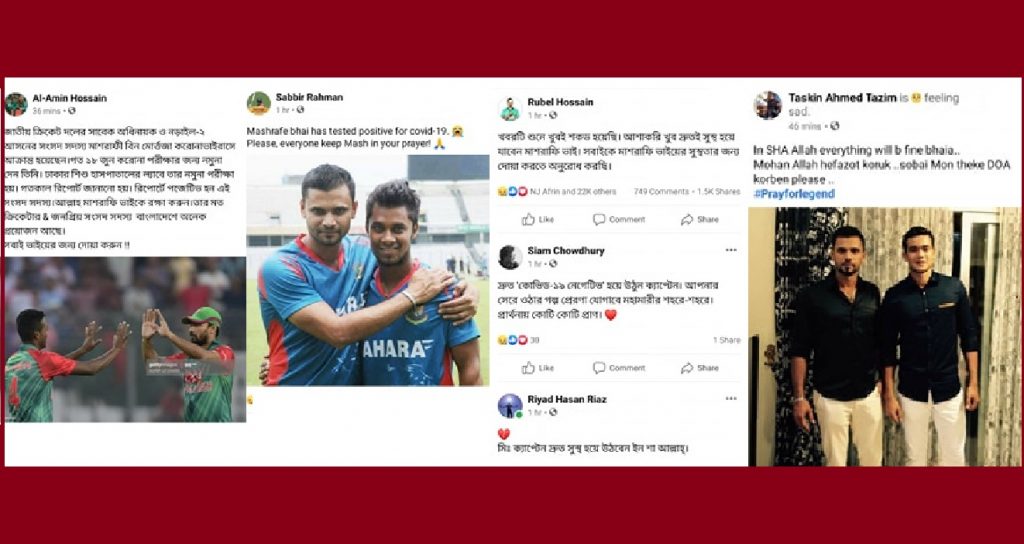 জাতীয় দলের পেসার আল আমিন হোসেন লিখেছেন, “জাতীয় ক্রিকেট দলের সাবেক অধিনায়ক ও নড়াইল-২ আসনের সংসদ সদস্য মাশরাফী বিন মোর্ত্তজা করোনাভাইরাসে আক্রান্ত হয়েছেন। গত ১৮ জুন করোনা পরীক্ষার জন্য নমুনা দেন তিনি। ঢাকার শিশু হাসপাতালের ল্যাবে তার নমুনা পরীক্ষা হয়। গতকাল রিপোর্ট জানানো হয়। রিপোর্টে পজেটিভ হন এই সংসদ সদস্য। আল্লাহ মাশরাফি ভাইকে রক্ষা করুন। তার মত ক্রিকেটার, জনপ্রিয় সংসদ সদস্য বাংলাদেশে অনেক প্রয়োজন আছে। সবাই ভাইয়ের জন্য দোয়া করুন।”