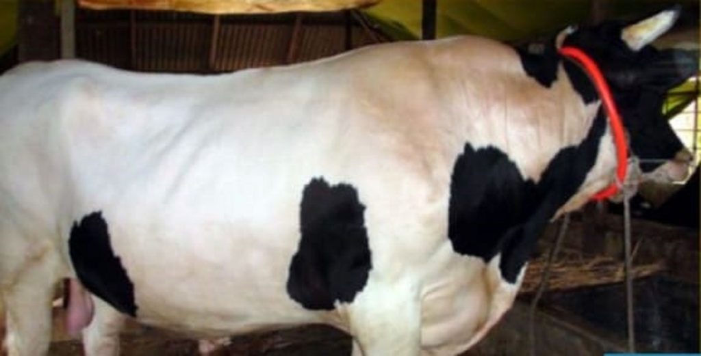মাত্র ৩ বছর বয়সী বড় সাহেব। সাদার মধ্য কাল রং। প্রতিদিন ৩০ কেজি গো-খাদ্য খাওয়াতে হয় বড় সাহেবকে।