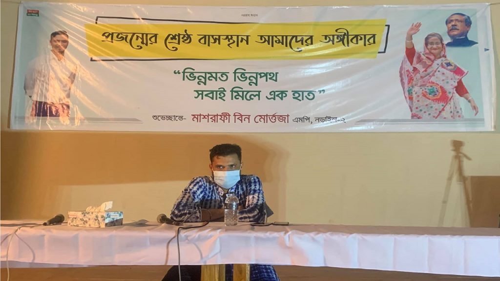 ‘ভিন্নমত ভিন্নপথ, সবাই মিলে একহাত’ এ শ্লোগানকে সামনে রেখে রোববার বেলা ১১টায় শিল্পকলা একাডেমি মিলনায়তনে জনতার মুখোমুখি হলেন নড়াইল-২ আসনের সাংসদ মাশরাফী বিন মোর্ত্তজা।