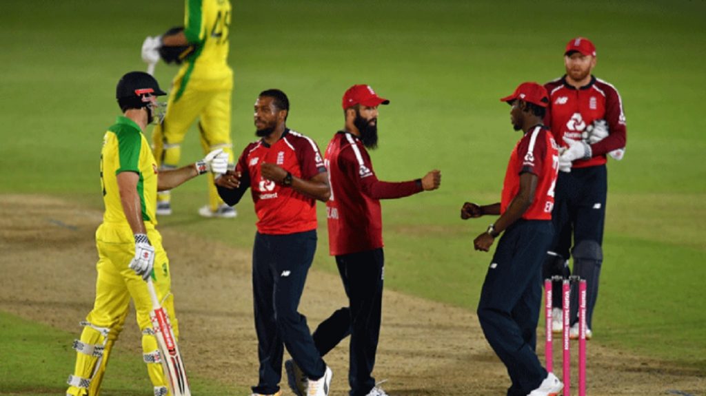সাউদাম্পটনে টস হেরে ব্যাট করতে নেমে শুরুতেই টম ব্যান্টনের উইকেট হারায় স্বাগতিকরা। এরপর জনি বেয়ারস্টো ও ডেভিড মালানে ঘুরে দাঁড়ানোর চেষ্টা ইংল্যান্ডের। ২১ রান করে এডাম জাম্পার শিকারে পরিণত হন মালান। থিতু হতে পারেননি বিলিংস ও ক্রিস জর্ডান। তবে বেয়ারস্টোর ৫৫ রানে ১৪৫ রানের পুঁজি পায় স্বাগতিকরা। জবাবে নিয়মিত বিরতিতে উইকেট হারাতে থাকে অস্ট্রেলিয়া।