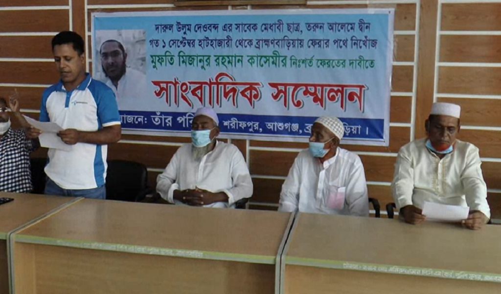 দু’সপ্তাহেও খোঁজ পাওয়া যায়নি ব্রাহ্মণবাড়িয়ার ইসলামী বক্তা মুফতি মাওলানা মিজানুর রহমান কাসেমীর। তার দ্রুত সন্ধান পেতে সংবাদ সম্মেলন করেছে পরিবার।