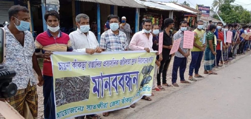 মানববন্ধনে জেলার শ্যামনগর, কালীগঞ্জ, দেবহাটা, আশাশুনিসহ বিভিন্ন উপজেলার কাঁকড়া চাষি ও ব্যবসায়ীরা অংশ নেন।
