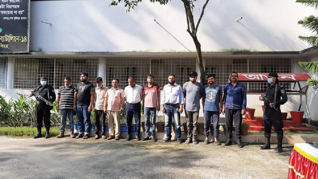 আটককৃতরা হলো- নুর হোসেন (৫২), রানা মিয়া (৩০), মমিনুর রহমান (৩২), মুরাদুজ্জামান (২৭), শামীম হোসেন (৪০), আরিফুল ইসলাম (২৯), ফেরদৌস অহিদ তুষার (২৯), মাহাবুর রহমান মুন্সি (৩৭), ফারুক মোল্লা (৪৮) ও বাবুল ওরফে বিজয় (৪৫)।