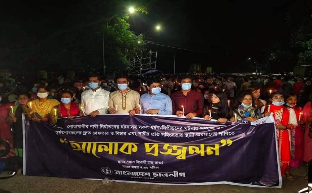 ঢাকা বিশ্ববিদ্যালয় ক্যাম্পাসে ধর্ষণ ও নিপীড়ন বিরোধী কর্মসূচি পালন করেছে বাংলাদেশ ছাত্রলীগ। সন্ধ্যায় টিএসটিতে রাজু ভাস্কর্যের পাদদেশে আলোক প্রজ্বলন করে বিক্ষোভ মিছিল করে ছাত্রলীগ।