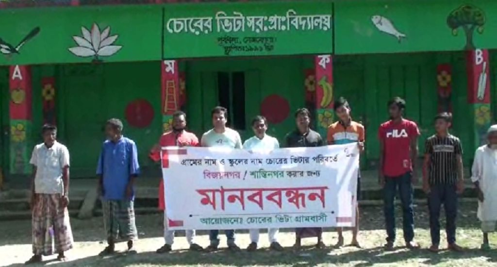 গ্রামের নাম ‘চোরের ভিটা’ পরিবর্তন করে বিজয়নগর করার দাবিতে শুক্রবার সকাল ১১টার দিকে মানববন্ধন করেছে নেত্রকোণার পূর্বধলা উপজেলার ‘চোরের ভিটা’ গ্রামবাসী।