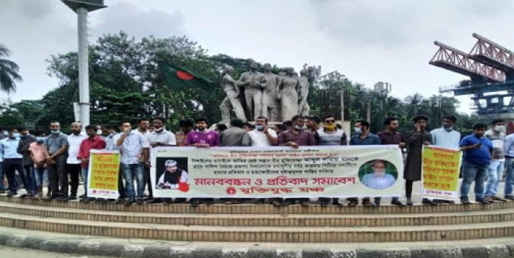 শনিবার বিকেলে রাজু ভাস্কর্যের পাদদেশে মানববন্ধন করেন তারা। এ সময় জাতির পিতার ভাস্কর্য নির্মাণের বিরোধীতাকারী ইসলামি আন্দোলন বাংলাদেশের নায়েবে আমির মুফতি ফয়জুল করিম ও হেফাজতে ইসলামের যুগ্ম মহাসচিব মামুনুল হকের কুশপুত্তলিকা দাহ করা হয়।