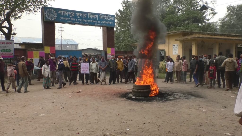 চিনিকল বন্ধের প্রতিবাদে রংপুরের শ্যামপুর চিনিকলের সামনে এবং বাজারে রোববার দিনভর টায়ারে আগুন জ্বালিয়ে বিক্ষোভ ও মানববন্ধন করেছে এলাকাবাসী, কর্মরত শ্রমিক, কর্মকর্তা ও আখ চাষিরা।