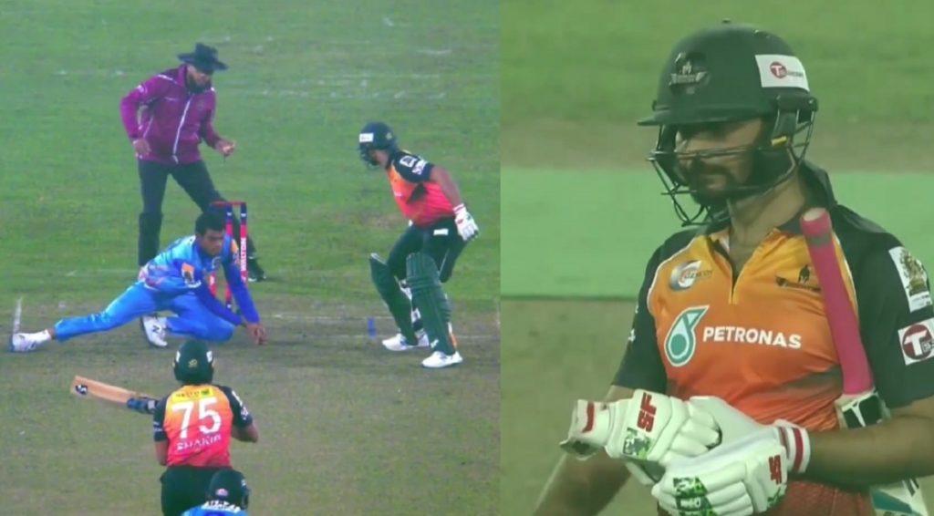 মাহমুদউল্লাহ রিয়াদ-ইমরুল কায়েসদের আগেই চার নম্বরে ক্রিজে নামেন মাশরাফী। সাকিবের সাথে আগ্রাসী জুটি গড়ে দলকে ভালো একটা স্কোর উপহার দিতেই হয়তো এই চমক। কিন্তু ৭.৩ ওভারে দলীয় ৫৩ রানে ১ বলে ১ রান করে রান আউট হয়ে সাজঘরে ফেরেন মাশরাফী। ক্রিজে তখন ব্যাট করছিলেন সাকিব। রাকিবুলের বলে তিনি সজোরে শট খেলেন স্ট্রেটে। সেটি রাকিবুলের হাতে লেগে ভেঙে ফেলে স্ট্যাম্প। নন স্ট্রাইকিং প্রান্তে থাকা ম্যাশের ব্যাট তখন অনেকটা উপরে। থার্ড আম্পায়ারের সিদ্ধান্তের আগেই অবশ্য ম্যাশ বুঝে গেছেন তাকে ফিরে যেতে হবে সাজঘরে। হলোও তাই। চমক জাগিয়েও রান আউটের ফেরে পড়ে দারুণ কিছু করে দেখানো হলো না দীর্ঘদিন পর ক্রিকেটে ফেরা মাশরাফীর।