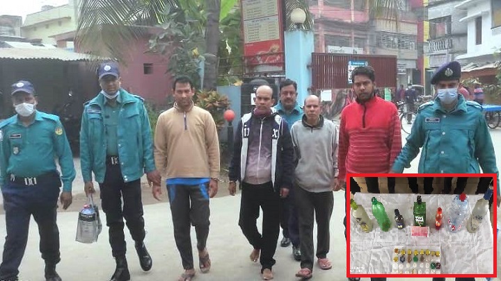 গ্রেফতারকৃতরা হলো, নগরীর পরিমল সিং, সাজু, বাপ্পা সিং ও ইফতেখার হোসেন ওরফে সুমন। পুলিশ তাদের নিকট থেকে মদের খালি বোতল, বিভিন্ন রাসায়নিক উপকরণ মিশ্রিত মদ, অ্যালকোহল ও কমলা কালারের গুড়ো রং উদ্ধার করেছে।