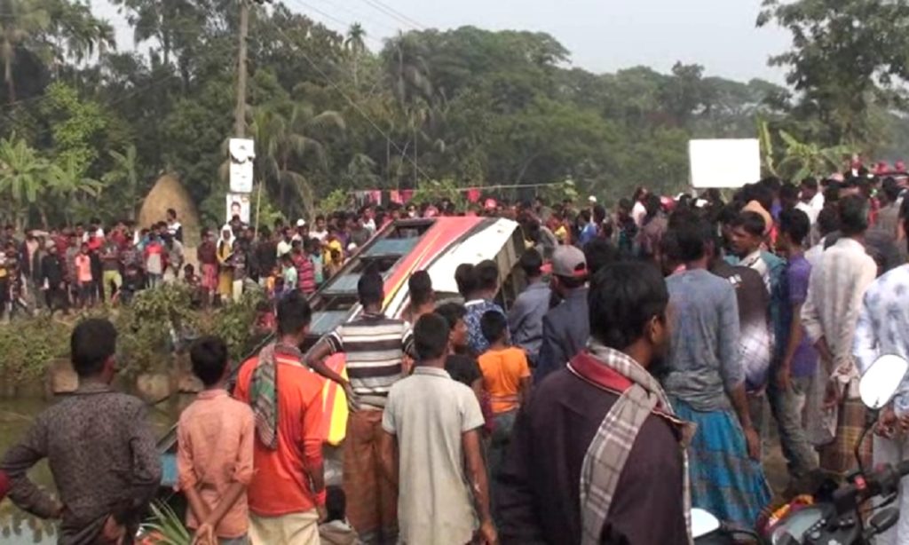 এলাকাবাসী জানায়, নেত্রকোণা-মোহনগঞ্জ সড়কের বাংলা পেট্রোল পাম্প এলাকায় যাত্রীবাহী একটি বাস নিয়ন্ত্রণ হারিয়ে একটি পুকুরে পরে গেলে অন্তত বিশজন আহত হয়েছেন। মোহনগঞ্জ থেকে নেত্রকোণার উদ্দেশে ছেড়ে আসা বাসটি বেলা দেড়টার দিকে নিয়ন্ত্রণ হারালে এ দুর্ঘটনা ঘটে।