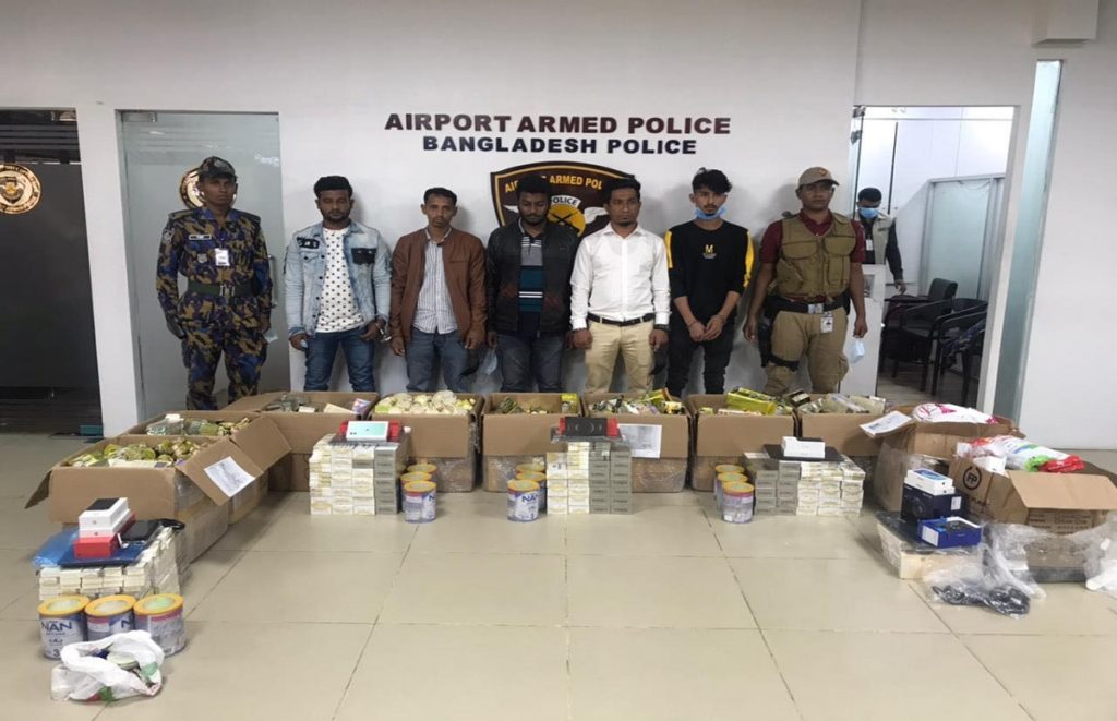 ঘটনার বিবরণে জানা যায়, ইসমাইল হোসেন পাটোয়ারী (৩২), মহিউদ্দিন (৩৪), মো. রাসেল হোসেন (২৯), লোকমান (৩৪) ও নুর জামান (২২) দুবাই থেকে বাংলাদেশ বিমানযোগে ঢাকায় অবতরণ করেন। তারা শুল্ক ফাঁকি দিয়ে কাস্টম চ্যানেল পার হয়ে ২ নম্বর আগমনী পার হয়ে বেড়িয়ে আসেন। তাদের কাছ থেকে ২০০ কেজি কসমেটিকস ও ১২৬ কার্টুন সিগারেট আটক করা হয়। যার বাজার মূল্য ৪০ লাখ টাকা।