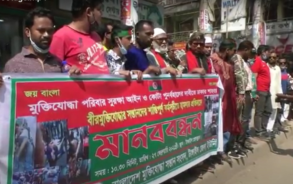 মানববন্ধনে বীর মুক্তিযোদ্ধা ও মুক্তিযোদ্ধার সন্তানদের উপর পুলিশি হামলার ঘটনায় তীব্র নিন্দা ও ক্ষোভ প্রকাশ করা হয়। এর আগে গত মঙ্গলবার দিনভর রাজধানীর শাহবাগ মোড় অবরোধ করে রাখেন তারা। এসময় পুলিশি হামলার শিকার হোন বলে অভিযোগ তাদের।