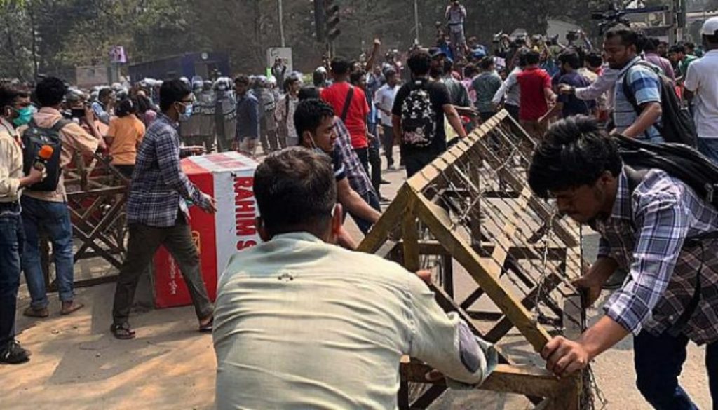 সোমবার বেলা বারোটা নাগাদ বেশ কয়েকটি প্রগতিশীল ছাত্র সংগঠনের নেতাকর্মীরা মন্ত্রণালয় ঘেরাও করতে গেলে পুলিশ তাদের বাধা দেয়। পরে সেখানে পুলিশের সাথে তাদের ধস্তাধস্তি হয়। এরপর সচিবালয়ের সামনে বসেই বিক্ষোভ শুরু করেন তারা।