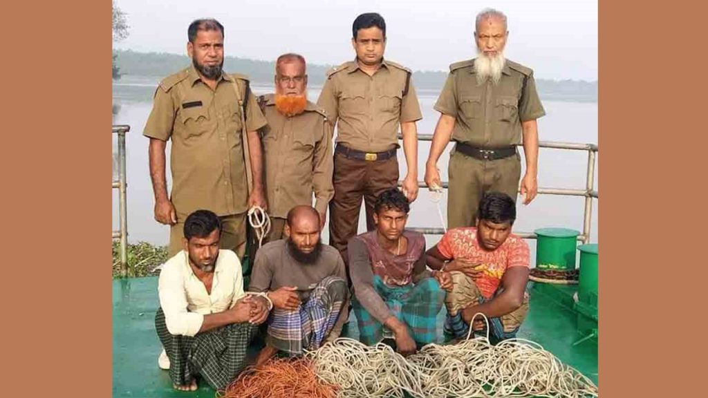 আটক চোরা শিকারিরা হলেন, বরগুনা জেলার আমতলী উপজেলার সোনাতলা গ্রামের আব্দুর রহিম শিকদার (৪০), একই গ্রামের মো. ফরহাদ শিকদার (২১), এই উপজেলার সকিনা গ্রামের মো. এনায়েত মুসল্লি (৩৭) ও মো. আউয়াল হাওলাদার (২০)।