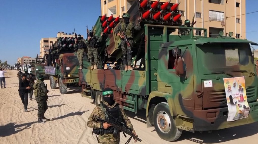অবরুদ্ধ উপত্যকার খান ইউনুস এলাকায় হয় মিছিলটি। যাতে রকেটসহ অন্যান্য ভারী অস্ত্রসজ্জিত ছিলেন হামাস যোদ্ধারা।