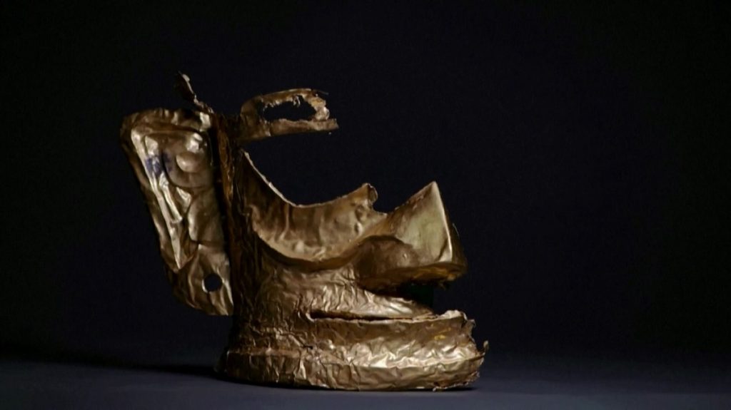 চীনের জাতীয় সংস্কৃতি বিষয়ক কর্তৃপক্ষ জানায়, আলোচিত সানজিংদুই প্রত্নতাত্ত্বিক স্থান থেকে এসব শিল্পকর্মের সন্ধান মেলে। যার মধ্যে ব্রোঞ্জ, সোনার ধাতু, হাতির দাঁত, জেড ও হাড়ের বিভিন্ন দ্রব্য রয়েছে। এর মধ্যে সবচেয়ে গুরুত্বপূর্ণ হিসেবে বিবেচনা করা হচ্ছে এই মুখোশকে। ২৮০ গ্রাম ওজনের এই মুখোশ পুরোটাই স্বর্ণ দিয়ে নির্মিত।