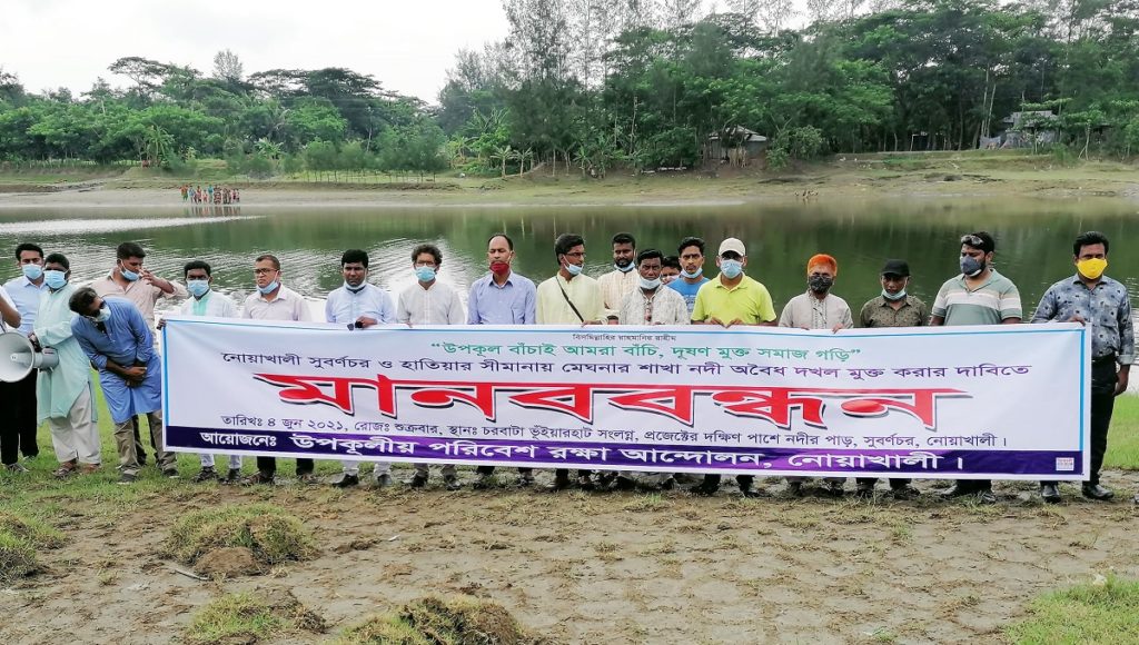 শুক্রবার বেলা ১১টার দিকে মেঘনার খাল পাড়ে উপকূলীয় পরিবেশ রক্ষা আন্দোলনের ব্যানারে এ মানববন্ধনে অংশ্রগহণ করেন প্রায় পাঁচ শতাধিক বিভিন্ন পেশার লোকজন।