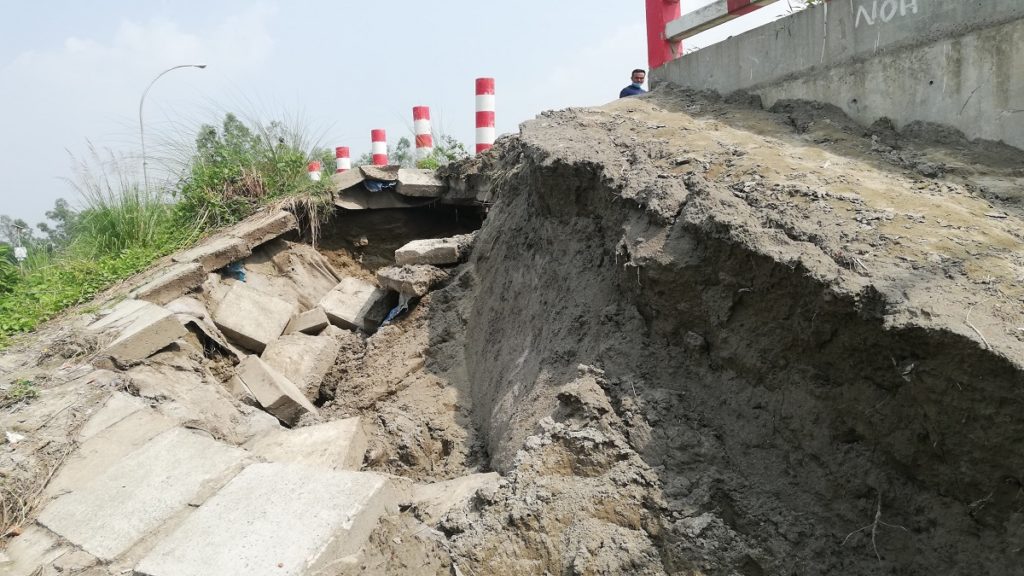 সড়কে চলাচলকারীরা জানিয়েছেন, গত দুইদিনের ভারী বর্ষণে এমন ধসের সৃষ্টি হয়েছে। সরেজমিনে গিয়ে দেখা গেছে, সেতুর শেষাংশ থেকে নির্মিত এপ্রোচ সড়কের এক পাশে বড় গর্তের সৃষ্টি হয়েছে। সড়কের গাইডওয়ালের ব্লকগুলো সরে গিয়ে এই অবস্থার সৃষ্টি হয়েছে।