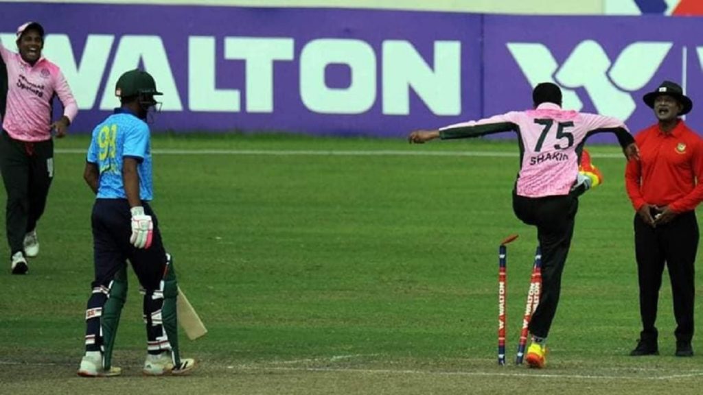 আবাহনী-মোহামেডানের ম্যাচে নিজের বোলিংয়ের সময় আবাহনীর অধিনায়ক মুশফিকুর রহিমের বিপক্ষে এলবিডব্লিউর আবেদনে আম্পায়ারের সাড়া না পেয়ে স্টাম্পে লাথি মারেন সাকিব। পরের ওভারেই বৃষ্টি নামলে আম্পায়ার খেলা বন্ধ করলে সাকিব আবারও স্টাম্প উপড়ে ফেলেন।