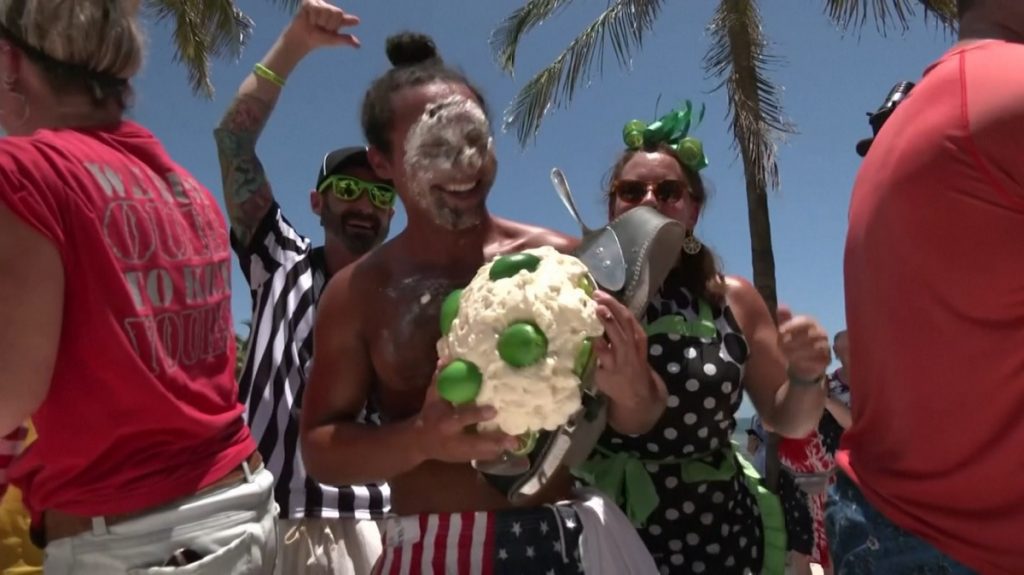 শর্ত ছিলো- পিঠের পেছনে বাঁধা থাকবে হাত। কয়েক আস্তর ক্রিম এড়াতে চোখে থাকবে গগলস। হুইসেল দেয়ার পর মোটমাট ২৫ প্রতিযোগী মুখ গুজে দেন কেক আকৃতির পাইয়ে। হাততালি আর চিৎকারে তাদের উৎসাহ দিতে থাকেন উপস্থিত দর্শকরা।