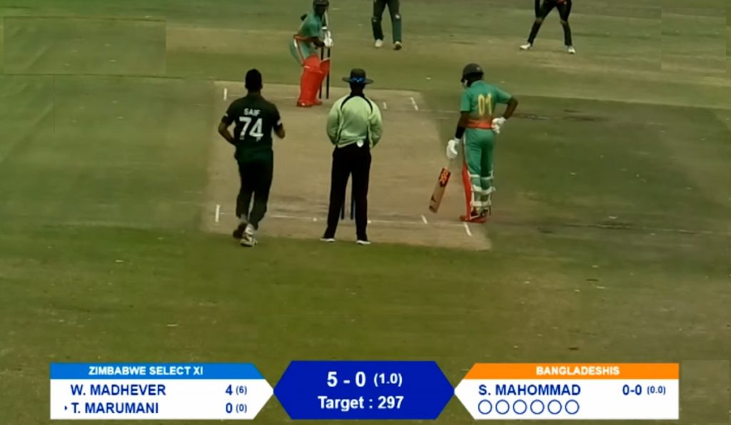 হারারের তাকাশিংগা স্পোর্টস ক্লাব গ্রাউন্ডে টস জিতে ব্যাট করতে নেমে তামিম-নাঈমের উদ্বোধনী জুটিতে দারুণ শুরু পায় বাংলাদেশ। ৮৭ রানের জুটি ভাঙ্গে নাঈম ২৫ রান করে আউট হলে। দলের পক্ষে তামিম সর্বোচ্চ ৬৬ এবং সাকিব করেন ৩৭ রান। এছাড়াও মিঠুনের ৩৯, মোসাদ্দেকের ৩৬, আফিফের ২৮ এবং সোহানের ১৮ তে নির্ধারিত ৫০ ওভারে ২৯৬ রান করে বাংলাদেশ।