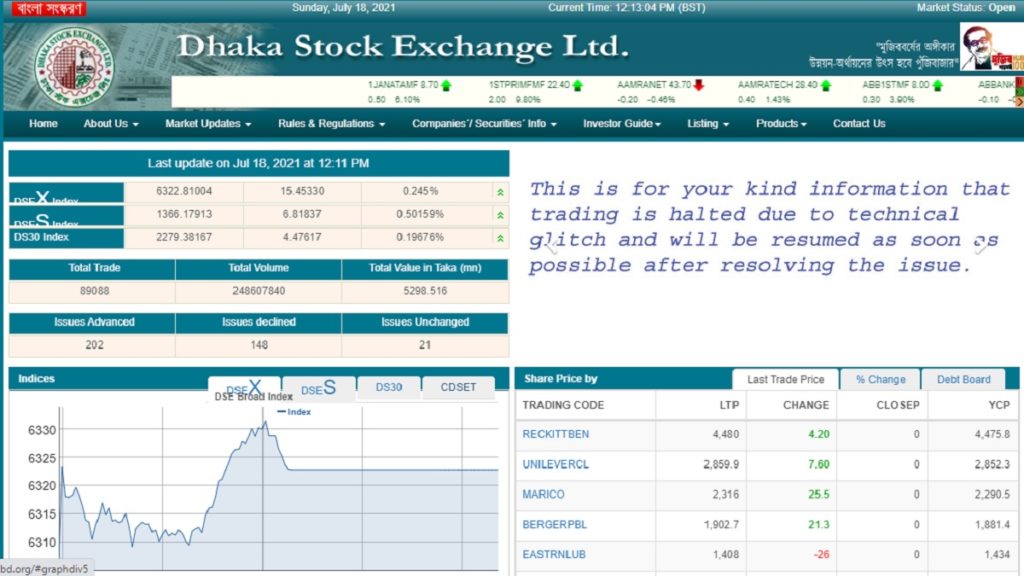 সপ্তাহের প্রথম কার্যদিবস রোববার (১৭ জুলাই) ঢাকা স্টক এক্সচেঞ্জের (ডিএসই) ওয়েবসাইটে কারিগরি জটিলতার কারণে লেনদেন বন্ধ আছে।