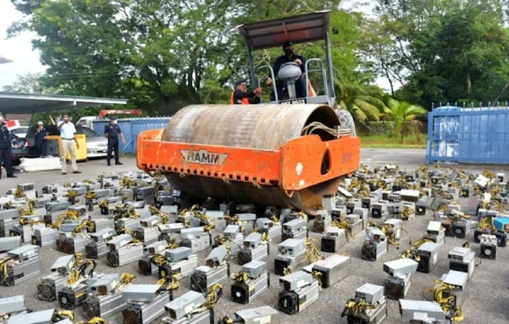 প্রায় এক হাজারের বেশি বিট কয়েন মাইনিং মেশিন জব্দ করেছে মালয়েশিয়ার পুলিশ। পরে এগুলো স্ট্রিমরোলার দিয়ে ধ্বংস করা হয়।