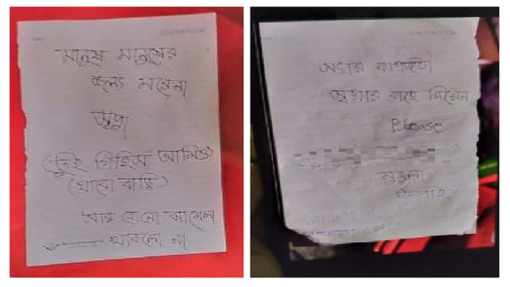মরদেহ উদ্ধারের সময় তার পাশে দুটি চিরকুট পায় পুলিশ। স্বপ্না নামে একজনকে উদ্দেশ্য করে একটি চিরকুটে লেখা ছিল, ‘মানুষ মানুষের জন্য মরে না স্বপ্না। তুই গেছিস আমি যাবো বাড়ি। আর কোনো ঝামেলা হবে না।’ অপরটিতে একটি ফোন নাম্বার দিয়ে ওই কাগজটি স্বপ্নার কাছে পৌঁছে দেওয়ার অনুরোধ লেখা ছিল।