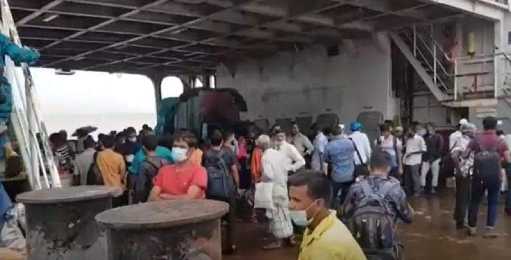 লকডাউনের ২য় দিনে শিমুলিয়া ফেরিঘাটে যানবাহনের উপস্থিতি কম থাকলেও যাত্রীদের চলাচল অব্যাহত আছে।
