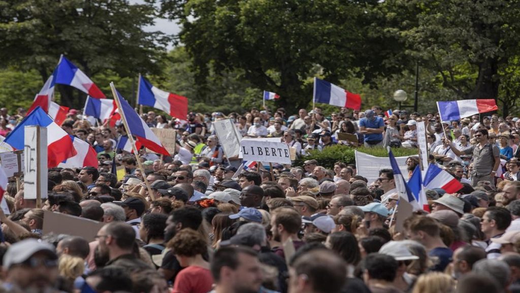 ম্যাকরন সরকারের নতুন স্বাস্থ্য নীতিমালার বিরুদ্ধে ফ্রান্সের রাস্তায় নামেন ১ লাখ ৬০ হাজারের বেশি মানুষ। তাদের অভিযোগ, ভ্যাকসিন গ্রহণ করেননি এমন মানুষরাও ভ্যাকসিন গ্রিন পাসের অবৈধ সুযোগে নিচ্ছেন। রাজধানী প্যারিসে জনস্রোত মোকাবেলায় জলকামান এবং টিয়ার গ্যাস ছোঁড়ে নিরাপত্তা বাহিনী।