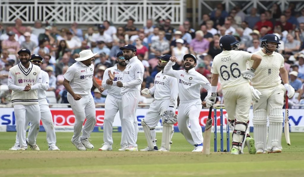 শামির বলে বেয়ারস্টো আউট হবার মাধ্যমে ভাঙে ৭২ রানের জুটি। ৪ বল পর লরেন্সকেও উইকেটের পেছনে ক্যাচ দিতে বাধ্য করেন শামি। ইংল্যান্ড আর মাথা তুলের দাঁড়াতে পারেনি। জস বাটলারকে বুমরা এবং জো রুটকে শার্দুল ঠাকুর আউট করলে শুরু হয় টেল এন্ডারদের লড়াই। স্যাম কারেন পাল্টা আঘাতে দলের রান কিছুটা বাড়ান। তবে বুমরার দুর্দান্ত দুটি ইয়োর্কারের কোনো জবাব ছিল না ব্রড ও অ্যান্ডারসনের কাছে। মাত্র ৬৫.৪ ওভার স্থায়ী ইংলিশদের প্রথম ইনিংস শেষ হয় মাত্র ১৮৩ রানে।