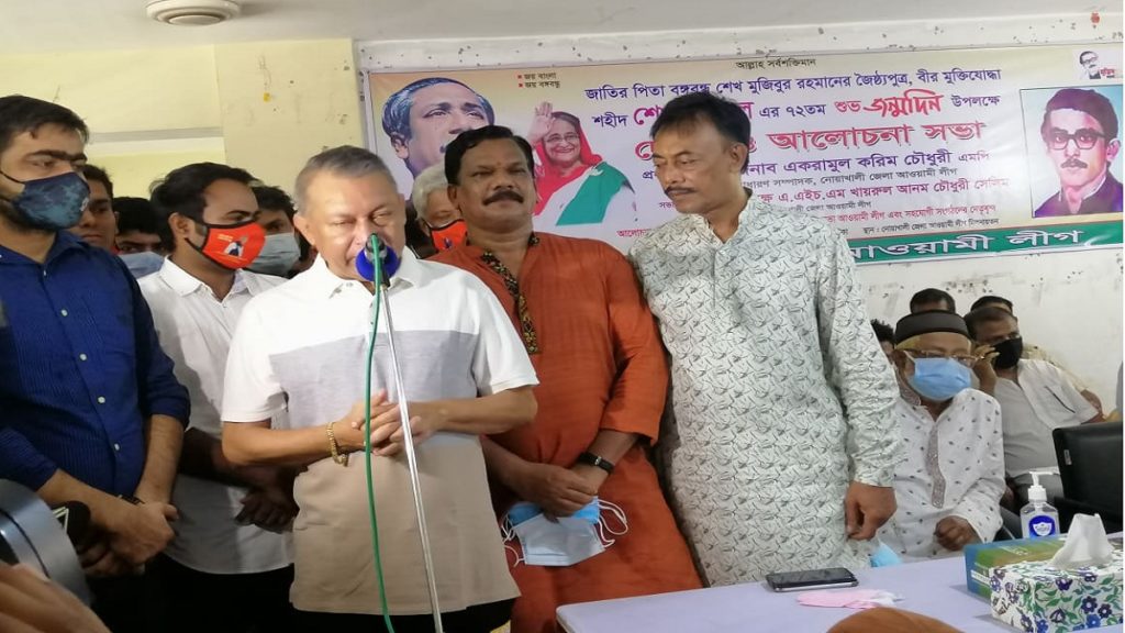 এ সময় প্রধান অতিথি হিসেবে উপস্থিত ছিলেন, নোয়াখালী জেলা আওয়ামী লীগের সাধারণ সম্পাদক একরামুল করিম চৌধুরী। অনুষ্ঠানে জেলা আওয়ামী লীগের সভাপতি খায়রুল আনাম সেলিমের সভাপতিত্বে আরো উপস্থিত ছিলেন, সদর উপজেলার চেয়ারম্যান এ কে এম সামছুউদ্দিন জেহান, জেলা আওয়ামী লীগের যুগ্ম সাধারণ সম্পাদক মাওলা লিটন, আবদুল মমিন বিএসসি, সদর উপজেলার আওয়ামী লীগের সাধারণ সম্পাদক অ্যাডভোকেট আতাউর রহমান নাছের, নোয়াখালী আইনজীবী সমিতির সাধারণ সম্পাদক অ্যাডভোকেট গুলজার হোসেন জুয়েল, জেলা যুবলীগের আহ্বায়ক ইমন ভট্ট প্রমুখ।