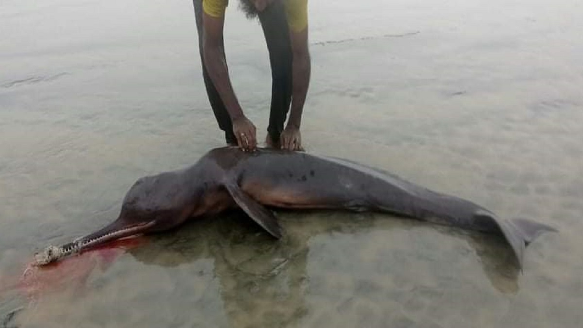 কুয়াকাটা সৈকতে ভেসে আসা মৃত ডলফিন।