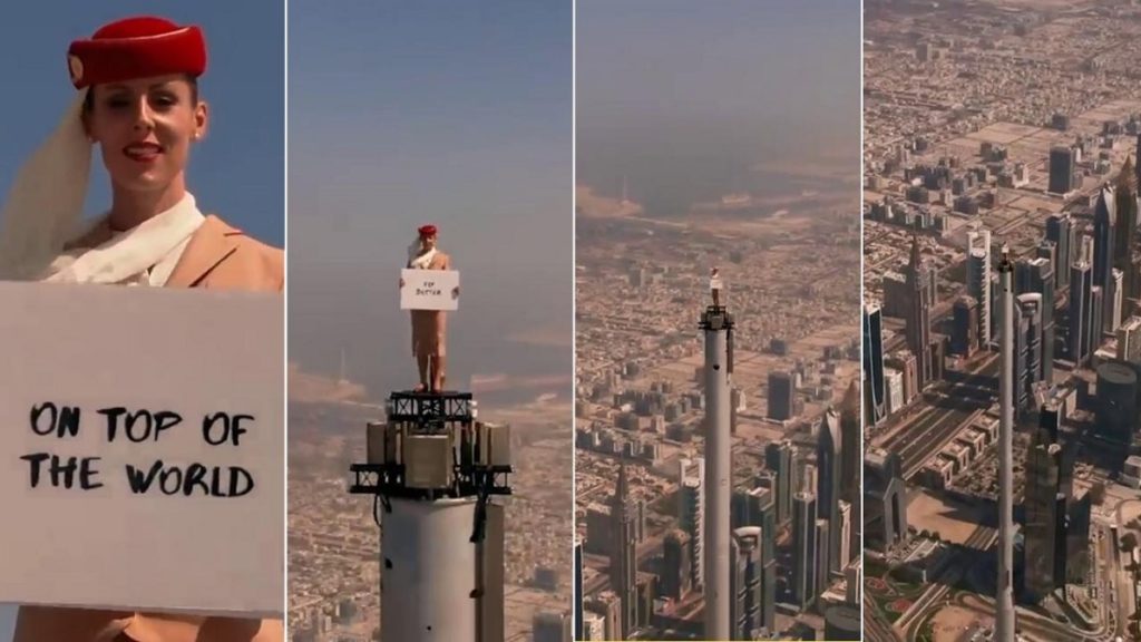 সম্প্রতি ভাইরাল হয়েছে সংযুক্ত আরব আমিরাতের সর্ববৃহৎ ও বিশ্বখ্যাত বিমান সংস্থা অ্যামিরেটসের ৩৩ সেকেন্ডের একটি বিজ্ঞাপন। যেখানে দেখা যাচ্ছে, অ্যামিরেটসের একজন বিমানবালা হাসিমুখে দাঁড়িয়ে আছেন বিশ্বের সর্বোচ্চ স্থাপনা বুর্জ খলিফার ছাদে, তার হাতে একটি প্ল্যাকার্ড, সেখানে লেখা ‘অন দ্যা টপ অফ দ্যা ওয়ার্ল্ড’।