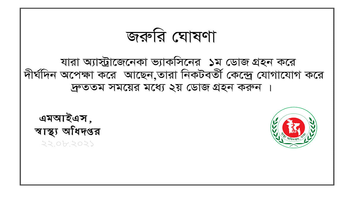 অ্যাস্ট্রাজেনেকার করোনা ভ্যাকসিনের প্রথম ডোজ নেয়ার অনেকদিন পরেও যারা দ্বিতীয় ডোজের জন্য এসএমএস পাননি, তাদের জন্য স্বাস্থ্য অধিদফতরের ম্যানেজমেন্ট ইনফরমেশন সেন্টার (এমএসআই) বিভাগ একটি জরুরি ঘোষণায় বলেছে, নিকটস্থ কেন্দ্রে যোগাযোগ করে তারা টিকার দ্বিতীয় ডোজ নিতে পারবে। এজন্য তাদের এসএমএস নিশ্চায়ন প্রয়োজন হবে না।