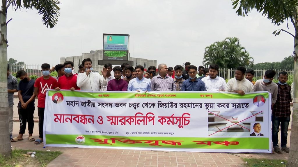 সকালে জাতীয় সংসদ ভবনের সামনে এক মানববন্ধনে মুক্তিযুদ্ধ মঞ্চের নেতারা অভিযোগ করেন, ১৫ আগস্ট স্বপরিবারে বঙ্গবন্ধুকে হত্যায় জড়িত ছিলেন জিয়াউর রহমান।