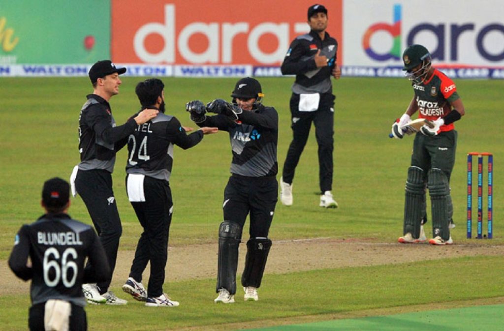 তারপর উইকেটে সেট হয়ে যাওয়া রাচিন রাভিন্দ্রাকে সরাসরি বোল্ড করেন অধিনায়ক মাহমুদউল্লাহ। মেহেদি হাসান নিজের বলেই ক্যাচ ধরে কিউই অধিনায়ক টম ল্যাথামকে ফেরালে আবারও বিপর্যয়ে পড়ে কিউইরা।