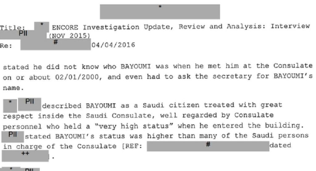 মূলত, টুইন টাওয়ার হামলার সাথে সৌদি আরবের কোনো সম্পর্ক ছিল কিনা সে সম্পর্কিত ১৬ পৃষ্ঠার নথি প্রকাশ করা হয়েছে। সেখানে কয়েকজনের সাক্ষাৎকারের লিখিত নোট দেখা যাচ্ছে। তার মধ্যে রয়েছে ‘পিআইআই’ হিসেবে চিহ্নিত এক ব্যক্তির সাক্ষাৎকার, যার সাথে ওই ঘটনার দু’জন হামলাকারী নাওয়াফ-আল-আজমি এবং খালিদ-আল-মিদহারের সাথে যোগাযোগের প্রমাণ মিলেছিল। এছাড়া একজন ভুক্তভোগীর সাক্ষাৎকারও আছে এই নথিতে।