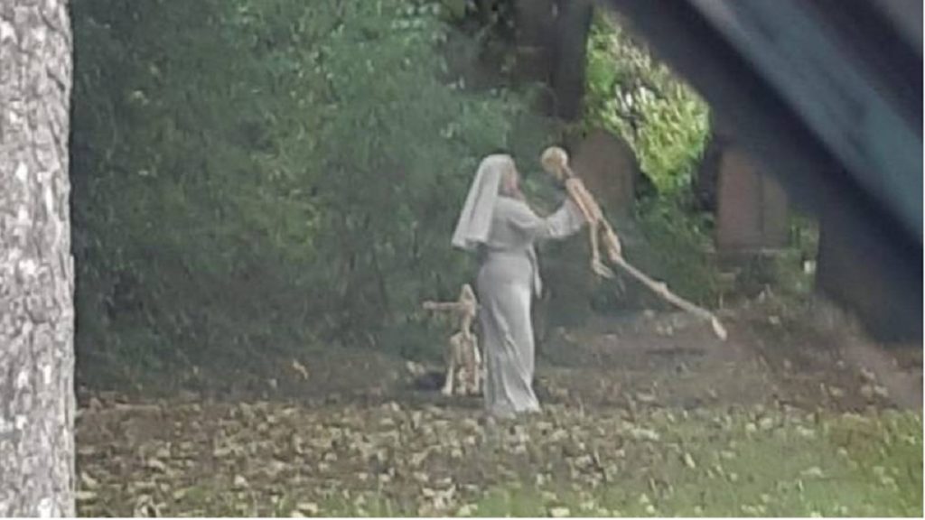 কঙ্কালের সাথে নাচ! অবাক হচ্ছেন নিশ্চয়। ঠিক এমনই একটা ভিডিও ভাইরাল হয়েছে সামাজিক মাধ্যমে। ভিডিওতে দেখা যায়, কবরস্থানে সন্ন্যাসিনীর পোশাক পরা এক মহিলার দু’টি কঙ্কালের সাথে নাচছেন।