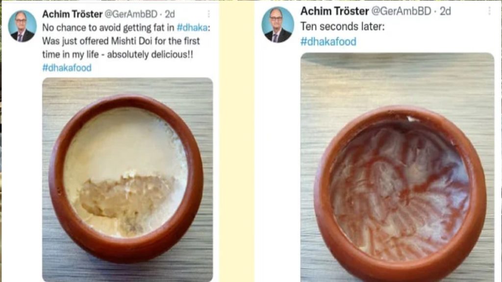 রাষ্ট্রদূত নিজেই একটি হাঁড়িভর্তি দইয়ের ছবি তার টুইটারে পোস্ট করেছেন। সেখানে তিনি লিখেছেন, ঢাকায় মোটা হওয়া থেকে বাঁচার কোনো সুযোগ নেই। জীবনে প্রথমবারের মতো কেউ মিষ্টি দই খাওয়ালো। কী যে সুস্বাদু!!