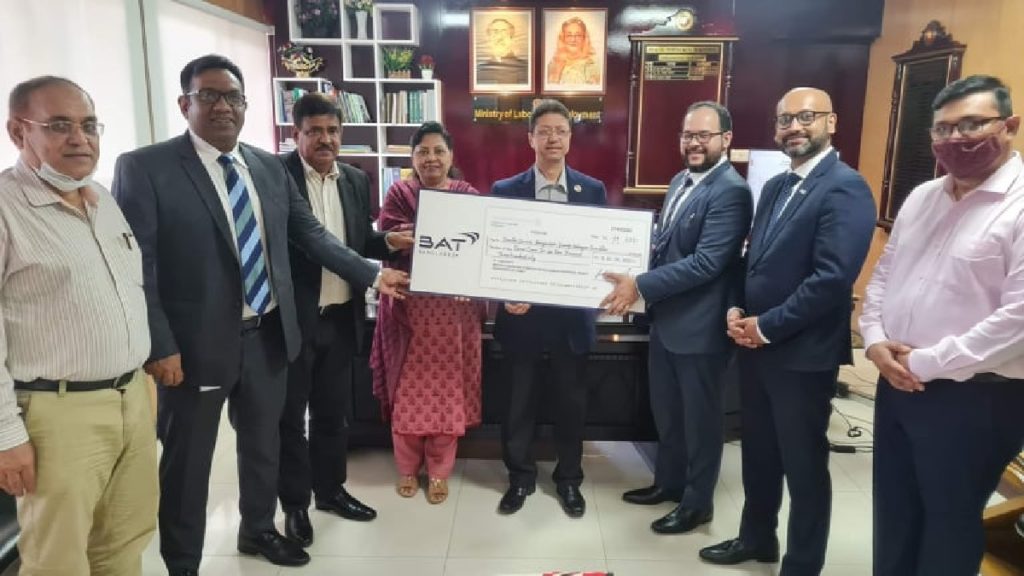 বৃহস্পতিবার (১৬ সেপ্টেম্বর, ২০২১) সচিবালয়ে মন্ত্রণালয়ের সম্মেলন কক্ষে শ্রম ও কর্মসংস্থান সচিব মো. এহছানে এলাহীর হাতে বিএটি বাংলাদেশ এর মানবসম্পদ বিভাগের প্রধান সাদ জসিম, এক্সটার্নাল অ্যাফেয়ার্স প্রধান শেখ শাবাব আহমেদ, কোম্পানির দুই জ্যেষ্ঠ ব্যবস্থাপক- মেহেদী আরিফ মোজাম্মেল এবং আখতার আনোয়ার খান- এই চার সদস্যের প্রতিনিধি দলের পক্ষ থেকে চেক হস্তান্তর করা হয়। এসময় বাংলাদেশ শ্রমিক কল্যাণ ফাউন্ডেশনের মহাপরিচালক বেগম জেবুন্নেছা করিম ও অন্যান্য ঊর্ধ্বতন কর্মকর্তারা সেখানে উপস্থিত ছিলেন।