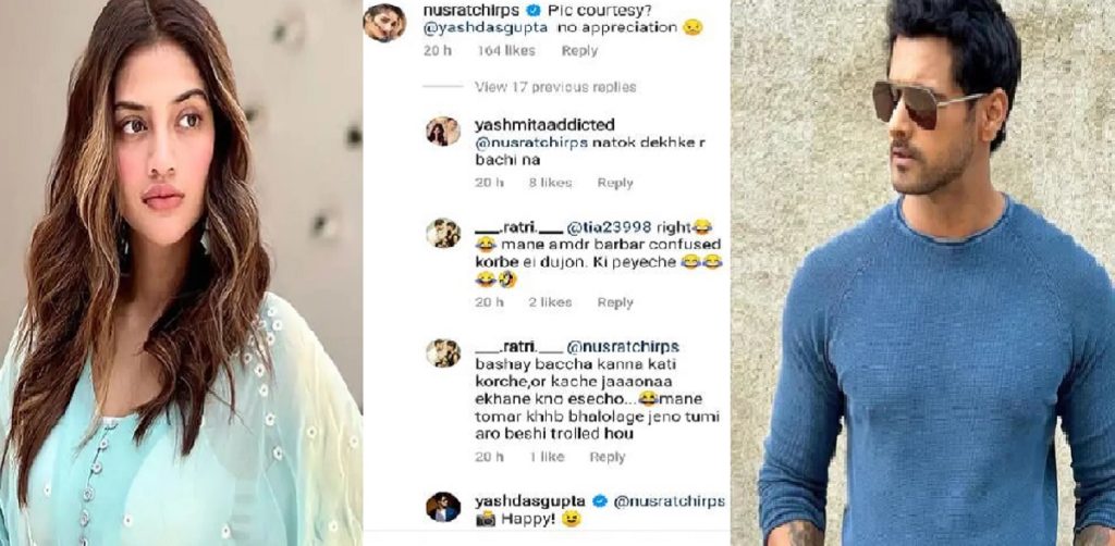 ইনস্টাগ্রামে তাদের এই সংক্ষিপ্ত খুনসুটি দেখে উচ্ছ্বসিত ‘যশরত’-এর ভক্তরা। মুখে কিছু না বলেও আকারে ইঙ্গিতে নিজেদের সম্পর্ক নিয়ে প্রায় সব কিছুই জানিয়ে দিয়েছেন তারা। ২ সেপ্টেম্বর নুসরাত নিজের একটি ছবি দিয়ে ঋণ স্বীকারের জায়গায় লেখেন ‘ড্যাডি’। তিনি যে আসলে কার কথা বলতে চেয়েছিলেন, তা বুঝে নিতে অসুবিধা হয়নি কারও।
