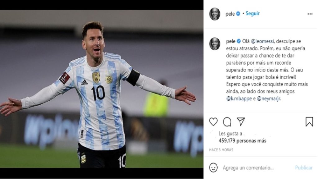 ইনস্টাগ্রামে গত শনিবার (২৫ সেপ্টেম্বর) পেলে তার পোস্টে লিখেন, হাই মেসি! বিলম্বের জন্য দুঃখিত। তবে আরও একটি দারুণ রেকর্ড ছোঁয়ায় তোমাকে অভিনন্দন জানানোর সুযোগটা আমি মিস করতে চাই না। তোমার ফুটবল প্রতিভা অবিশ্বাস্য। আশা করি, সামনে দিনগুলোতে নেইমার ও এমবাপ্পের সাথে আরও অনেক কিছুই জিতবে তুমি।