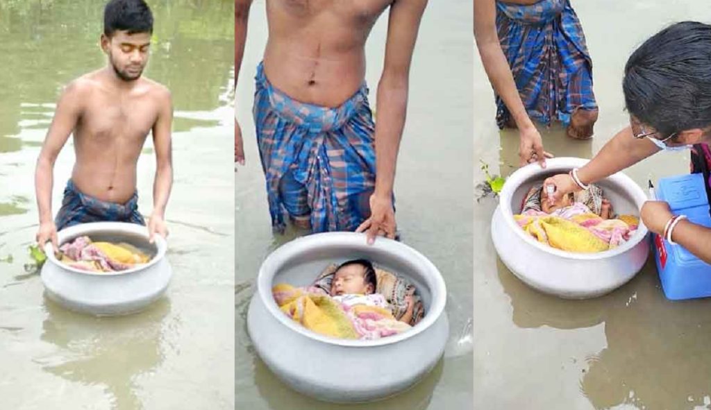 স্বাস্থ্যকর্মী নমিতা জানান, শিশুকে ওইভাবে আনতে দেখে তারাও মূল রাস্তা থেকে নেমে কিছুটা এগিয়ে যান। নিজামুদ্দিনের কাছে জানতে চান, হাঁড়িতে করে কেনো? তখন নীজামুদ্দিন তাদের জানান, স্ত্রী সাফিয়া খাতুনের পানি ঠেলে আসার ক্ষমতা নেই। আবার তিনি নিজেও ১৫ দিন বয়সের ছেলেকে কোলে নিয়ে পানি ঠেলে আসতে ভয় পাচ্ছিলেন। কোনোভাবে বাচ্চাটি যদি পড়ে যায়! তাই কর্মীদের ডাক শুনেই বাড়িতে থাকা বড় মুখের হাঁড়িতে ছেলেকে কাঁথায় মুড়িয়ে শুইয়ে নিয়ে আসার পরিকল্পনা করেন নিজামুদ্দিন।