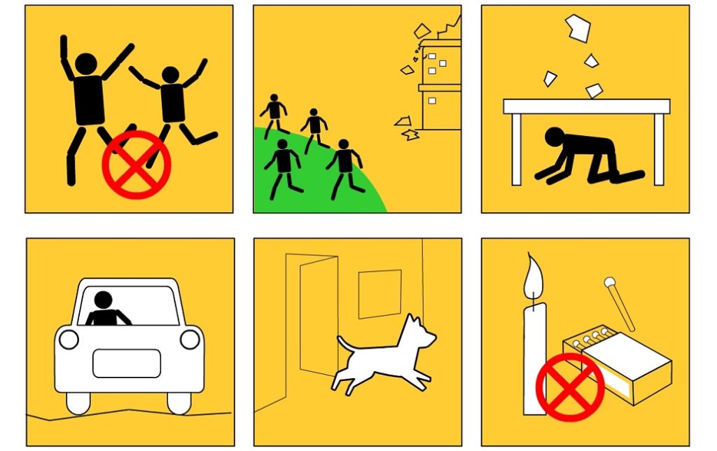 ১. ড্রপ, কাভার ও হোল্ড অন পদ্ধতিতে মেঝেতে বসে পড়ুন, কোনো মজবুত আসবাবের নিচে আশ্রয় নিন এবং কিছুক্ষণ বসে থাকুন। হেলমেট পরে বা হাত দিয়ে ঢেকে মাথাকে আঘাত থেকে সর্বোচ্চ গুরুত্ব দিয়ে রক্ষা করুন।